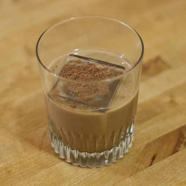 Build-in-glass: Add ingredients together and stir. Add ice and chocolate powder on top. ¡Salud!