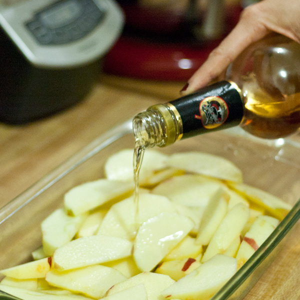 Peel the apples and cut them in half lengthwise. Scoop out the cores and discard. Cut the apple halves lengthwise into 1/2- to 3/4-inch-thick slices—there should be about 6 cups total. Transfer the apple slices to an ungreased 8-inch-square baking dish and spread them out evenly. Drizzle up to 1/4 cup of water AND 1 oz Apple Brandy over the apples—use less water if the apples are particularly juicy.