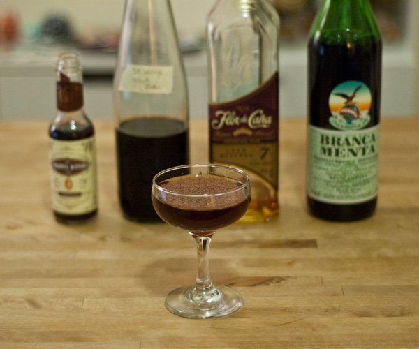 I wanted to make a Mint Chocolate drink which was neither very sweet nor anything like a “mint chocolate Martini” (hint, not a Martini, quit calling it a Martini). I turned to my fave aged rum, Flor de Caña 7, added the totally awesome St George NOLA Coffee Liqueur and Scrappy’s Chocolate Bitters instead of Crème de Cacao. The result is a bitterly chocolate mint cocktail, powerful enough to get us through the frigid winter, yet tasty enough to ask for another.