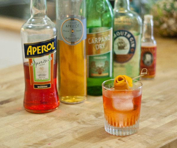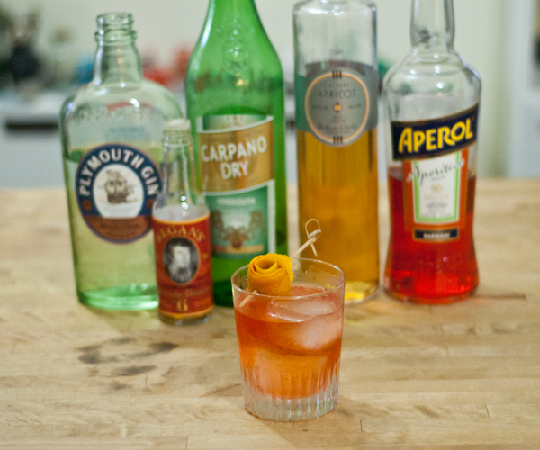 For the spectacular Negroni-Apri, I’m subbing Aperol + Apricot Liqueur for Campari, Carpano Dry Vermouth for Carpano Antica, and keeping the Plymouth Gin (never not Plymouth Gin). To this we add Orange Bitters, that lovely Orange Peel rose and BOOM, we’ve got a totally fabulous summery Negroni variation.